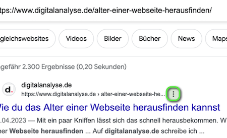 Das Datum der Veröffentlichung kannst du auch im Bereich “Informationen zu diesem Ergebnis” herausfinden. Kopiere dazu die komplette URL in die Google-Suche. Klicke dann auf das 3-Punkt-Menü, was hinter der URL steht. Es öffnet sich ein Menü. Klicke auf Mehr über diese Seite.