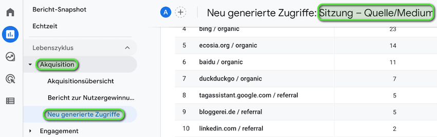 Solltet ihr erst kürzlich auf GA4 umgestiegen sein, habt ihr möglicherweise nur wenige Referrals in euer Property. Kopiert euch die Verweise aus dem alten Universal Analytics heraus. Diese findet ihr unter Akquisition > Alle Zugriffe > Verweise.
