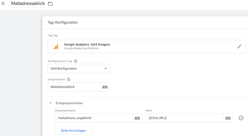 Im Feld Konfigurations-Tag wählt ihr eure entsprechende GA4-Property. Im Feld darunter (Ereignisname) schreibe ich wieder Mailadresseklick. Klickt dann einmal auf Ereignisparameter darunter und sagt Zeile hinzufügen. Als Ereignisparamter legt ihr eine Bezeichnung fest, die ihr später in Google Analytics 4 seht. Hier am besten nur Kleinbuchstaben und mit Bindestrich arbeiten. Ich nehme mailadresse_angeklickt. Im rechten Feld klickt ihr hinten auf das Baustein-Symbol und sagt {{Click URL}}.